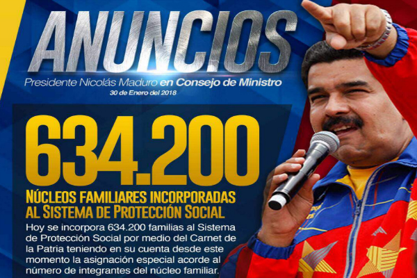 Caracas, 30 de enero de 2018.- El presidente de la República, Nicolás Maduro, aprobó este martes Bs 500.000 millones para incluir a un millón de venezolanos en el bono de reyes, que contempla un monto de 500.000 bolívares y ha sido adjudicado a ocho millones de ciudadanos este mes, se informó en una nota de prensa presidencial.