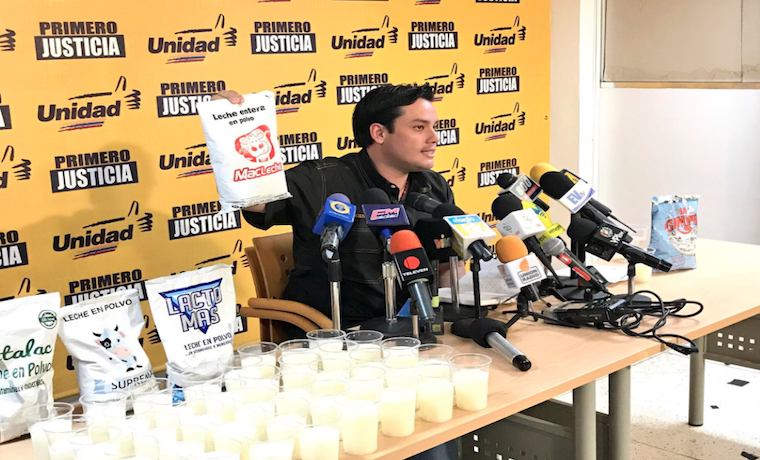 "Las ocho marcas de leche distribuidas por el Gobierno a través de las cajas Clap y que son importadas desde México, incumplen con las normas internacionales, mexicanas y venezolanas y violan el artículo 305 de la Constitución", según denunció este lunes el diputado Carlos Paparoni del Partido Primero Justicia en una rueda de prensa en la que expuso la investigación sobre el tema que han venido realizando el Parlamento y algunos medios de comunicación, Paparoni señaló que "las personas que adquieren este producto necesitan más de 40 vasos de esa leche para obtener los mismos nutrientes que obtiene de un vaso de la leche que se produce en el país".