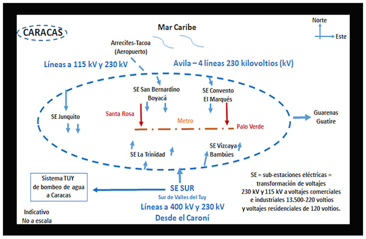 En el gráfico –facilitado por Víctor Poleo–, las pequeñas flechas en azul indican distribución residencial+comercial+industrial desde subestaciones principales en Caracas, a su vez anillado por líneas de 230 kV desde el litoral y el Caroní. Los circuitos urbanos centro-oeste datan de los años 1930, los del este y sur-este/oeste de los años 1950