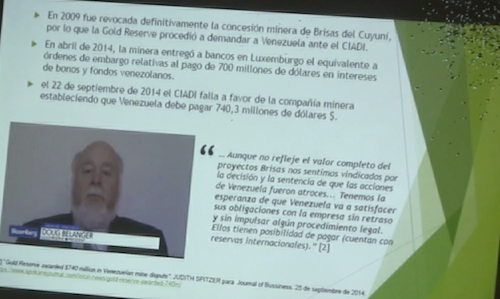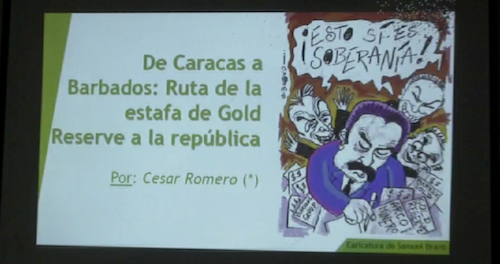 En este primer video, luego de la introducción hecha por Emma Salazar, donde explicó los objetivos y alcances de la actividad, Romero hizo una presentación general del caso del Arco Minero del Orinoco, el AMO, denominó a la misma: De Caracas a Barbados: ruta de la estafa de la Gold Reserve a la República.