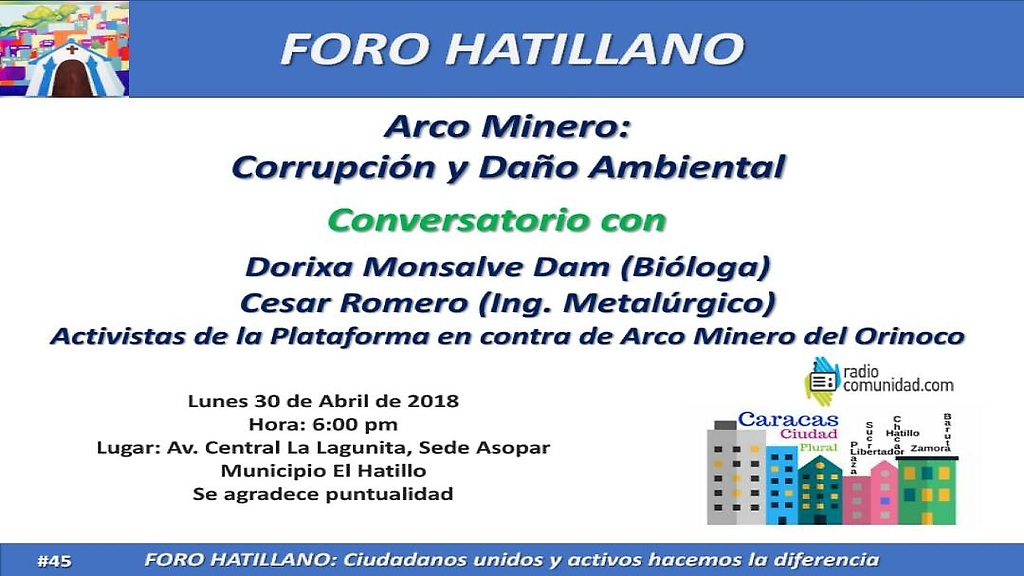 29/04.- Este lunes 30 de abril a partir de las 6pm se estará desarrollando el conversatorio ¨Arco Minero: Corrupción y Daño Ambiental¨ en el Municipio el Hatillo, sede de ASOPAR, Av. Central La Lagunita. El conversatorio estar conducido por los integrantes de la Plataforma contra el Arco Minero del Orinoco Dorixa Monsalve (Biologa) y César Romero (Ingeniero).