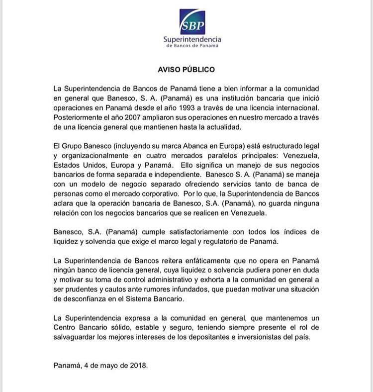 5 de mayo de 2018.- La Superintendencia de Bancos de Panamá (SBP) emitió un comunicado aclarando la situación de la entidad financiera Banesco S. A. de Panamá, la cual es completamente independiente de la filial en Venezuela y que sus actividades bancarias están en regla.