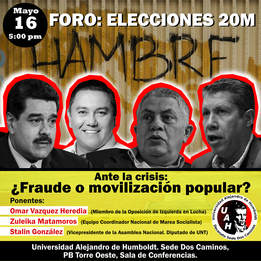 Los ponentes serán Omar Vázquez Heredia, miembro de la Oposición de Izquierda en Lucha; Zuleika Matamoros, militante de Marea Socialista; y Stalin González, integrante del Frente Amplio Venezuela Libre.