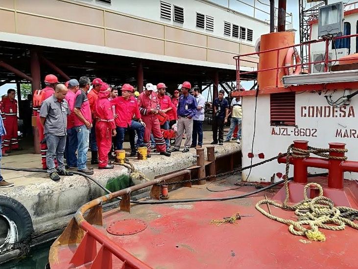 Maracaibo, 16 de mayo de 2018.- El vicepresidente ejecutivo de Petróleos de Venezuela, S.A. (PDVSA), Ysmel Serrano, y los directores externos Yurbis Gómez y Ricardo León inspeccionaron las labores de recuperación de embarcaciones que ejecutan los trabajadores de la empresa mixta Petrozamora en el muelle Libertador II de Bachaquero en la Costa Oriental del Lago, estado Zulia, informó una nota de prensa PDVSA.