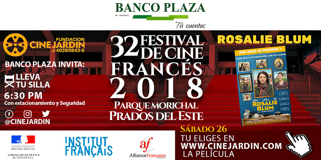 21/05.- La Fundación Cine Jardín en apoyo del Banco Plaza, y en colaboración con La Embajada de Francia en Venezuela, La Alianza Francesa y el Instituto Francés los invitan a la 4ta proyección del 32 Festival de Cine Francés con la película seleccionada por el público “Rosalie Blum”, el sábado 26 de mayo en el Parque Morichal de Prados del Este la proyección es al aire libre totalmente gratis y ha sido seleccionada por el público en la página web cinejardin.com. Esta será la última oportunidad de ver y apreciar el Festival de Cine Francés 2018 al aire libre con Cine Jardín, y en esta oportunidad en el Parque Morichal donde contamos con zona para estacionar en los alrededores y apoyo de los cuerpos de seguridad.