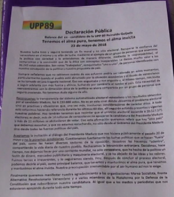 Jueves, 24 de mayo de 2018.- El miércoles 23 de mayo, en Caracas, el candidato presidencial Reinaldo Quijada de la UPP 89, acompañado de un grupo de dirigentes de los estados Miranda, Carabobo y Vargas de esa tolda política, ofreció una rueda de prensa donde fijaron posición sobre las elecciones presidenciales del pasado domingo veinte. El voto por Quijada también recibió el apoyo de Marea Socialista y del Frente Alternativo Revolucionario Venezolano, a quienes dió su agradecimiento, aunque estas organizaciones no participaron de la rueda de prensa ni de la declaración del candidato, que habló exclusivamente en su nombre y el de la UPP89.
