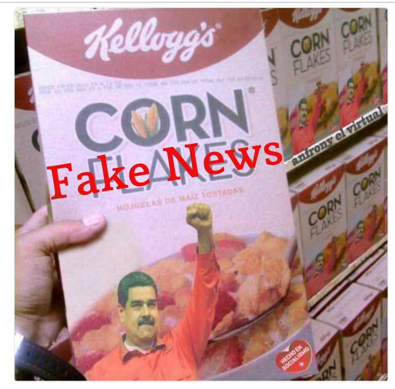 4 junio 2018 - Recientemente circuló en las redes sociales una imagen del presidente Nicolás Maduro en la que aparece supuestamente promocionando una nueva versión del reconocido cereal Corn Flakes de Kellogg’s.