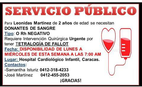 04 de junio de 2018.- A nuestra redacción llegó una solicitud para hacer de conocimiento público una solicitud de urgencia. El paciente Leonidas Martínez de dos (2) años de edad necesita con carácter de urgenica donante de sandre tipo O Rh NEGATIVO. El paciente requiere de una intervención quirurgica por tener TETRALOGÍA DE FALLOT.