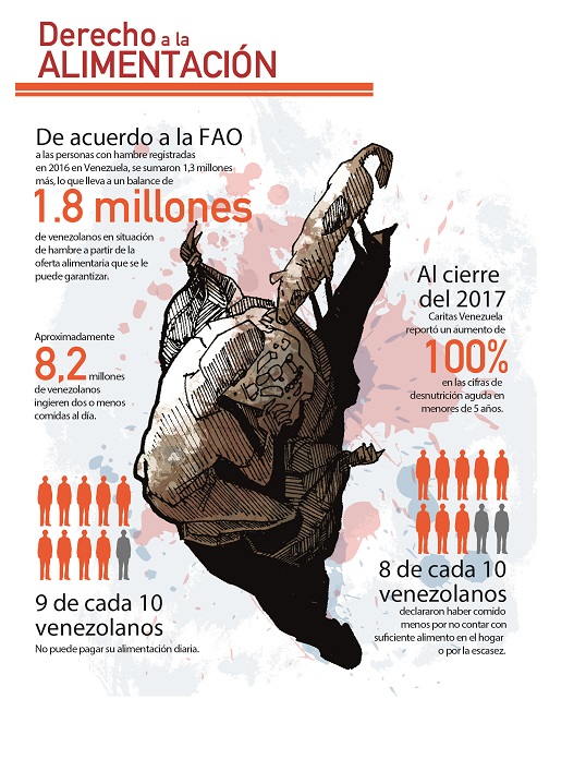 03/07.- En nota de prensa elaborada por Provea se dio a conocer el más reciente informe que realizó la organización en relación al acceso a la alimentación como derecho humano en Venezuela. En éste informe se recojen cifras drámaticas reconstruidas a partir de trabajo de campo o a través de centros de investigaciones y observatorios en algunos casos institucionales y en otros independientes. A continuación reproducimos el contenido de dicho informe junto a la infrografia elaborada por la ONG de derechos humanos: