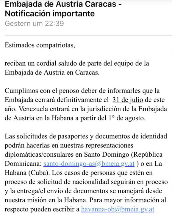 A través de un breve comunicado emitido por los diplomáticos austríacos, se indicó además que aquellos que deseen tramitar el pasaporte y otros documentos de identidad, lo deberán realizar en las embajadas ubicadas en La Habana y en República Dominicana.