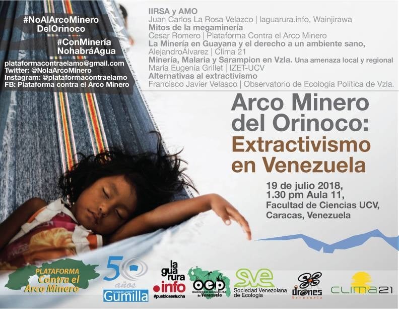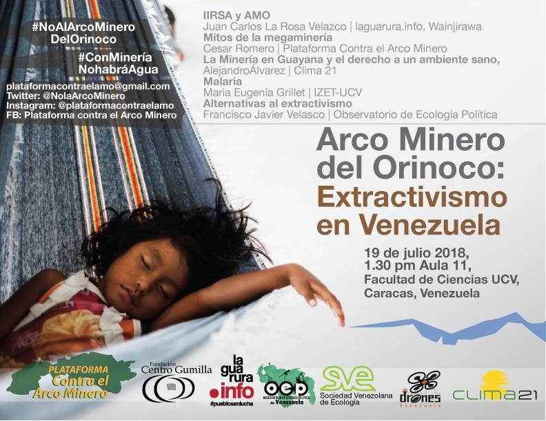17/07.- Acercándose el 22 de julio, Día Mundial contra la Megaminería, se hacen necesarios espacios de encuentro y discusión sobre el modelo extractivista y expoliador del ambiente que busca profundizar el gobierno de Nicolás Maduro a través del proyecto Arco Minero del Orinoco. Con el objetivo de discutir y organizarnos contra las consecuencias socioambientales de éstas políticas invitamos al FORO: Arco Minero del Orinoco: Extractivismo en Venezuela, que se realizará el jueves 19 de julio de 2018 en el aula 11 de la Facultad de Ciencias de la Universidad Central de Venezuela (UCV), Caracas, a partir de la 1:30pm.
