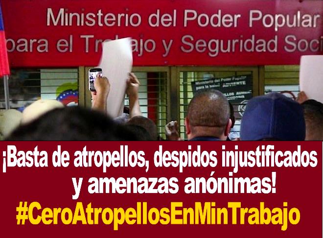 Como se ha reseñado en estas páginas, los trabajadores del Ministerio del Poder Popular para el Proceso social de Trabajo (MPPPST) denuncian los fuertes atropellos que recibió un trabajador de la institución, por parte de dos directivos y de personas sin clara identificación como trabajadores del ministerio. A este trabajador, además, le impiden entrar a su lugar de trabajo y le han dejado de cancelar su salario, sin que haya ningún tipo procedimiento legal ni administrativo que sustente ese despido indirecto y embargamiento de sueldo.