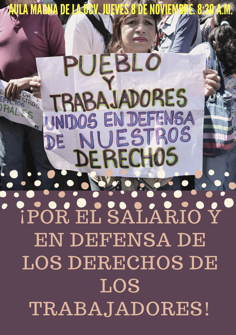 07 de noviembre de 2018.- Por el Salario y en defensa de los derechos de los trabajadores, diversos sindicatos organizados en la Intersectorial de Trabajadores de Venezuela convocan para este miércoles 7 de noviembre a un encuentro de dirigentes sindicales y vocerías de trabajadores a partir de las 8 de la mañana, y de igual manera, para el jueves 8 de noviembre a un acto con los trabajadores en el Aula Magna de la UCV, también a las 8 a.m., donde se expondrían las conclusiones del encuentro.