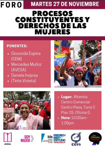 El primero de ellos: Procesos Constituyentes y Derechos de las Mujeres, se llevará a cabo este martes 27 de noviembre, a las 10:00 am, en el CC Centro Plaza, Torre C, piso 15, Oficina G.