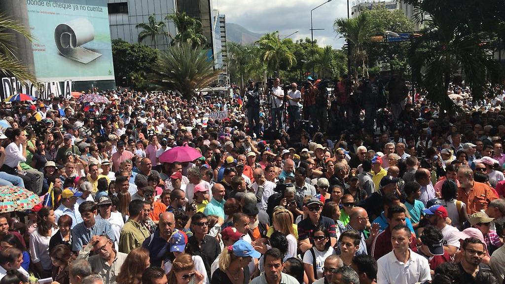 La avenida Francisco de Miranda está llena de partidarios que, con banderas y pancartas, apoyan el acto previo a las declaraciones de Juan Guaidó, presidente de la Asamblea Nacional.