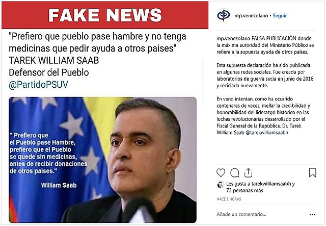 Caracas, 7 de febrero de 2019.- Tarek William Saab, Fiscal General de la República y máxima autoridad del Ministerio Público, denuncia la circulación de una Fake News que le atribuye haber declarado: "prefiero que el pueblo pase hambre y no tenga medicinas que pedir ayuda a otros países".