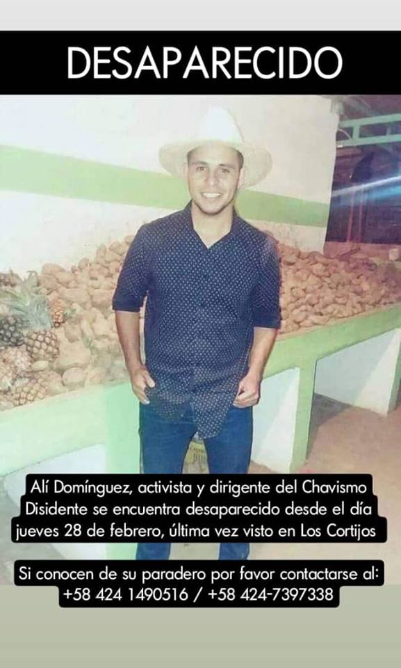 Según información de fuentes cercanas a Domínguez, el joven quien ejerció vocerías estudiantiles durante su carrera en la UBV denunció casos de corrupción de las autoridades. Había recibido amenazas de presuntos organismos de seguridad y ese jueves que desapareció había participado en actividades políticas.