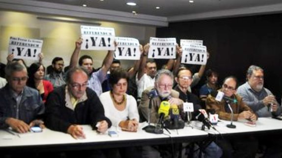 Desde esta Plataforma, estamos impulsando un movimiento nacional para la convocatoria de un Referéndum Consultivo con base en los establecido en los artículos 5, 70 y 71 de la Constitución, para que el pueblo venezolano decida si quiere o no renovar los poderes públicos, previa reestructuración del Consejo Nacional Electoral con el fin de garantizar la transparencia y confiabilidad del sufragio. Este puede ser convocado mediante acuerdo entre la Asamblea Nacional y el Gobierno. Por nuestra parte, adelantaremos un proceso de recolección del 10% de las firma de los electores para formalizar la solicitud. Así mismo, estamos promoviendo el diálogo social y político incluyente, la negociación entre la AN y el gobierno, para avanzar en la construcción de la ruta de la paz para el cambio y el rescate de la soberanía popular. Esto pasa por la convocatoria al referido referéndum y por el abordaje, sin más dilaciones, de un plan de emergencia y recuperación nacional, que atienda la emergencia social y la estabilización de la economía.