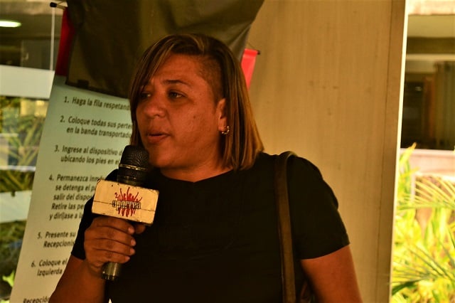 Zuleika Méndez, revolucionaria antiburocrática y comunicadora popular, habla a los presentes en el Lobby de la CANTV sobre la gravedad de la violación del derecho a la comunicación y la necesidad de defenderlo
