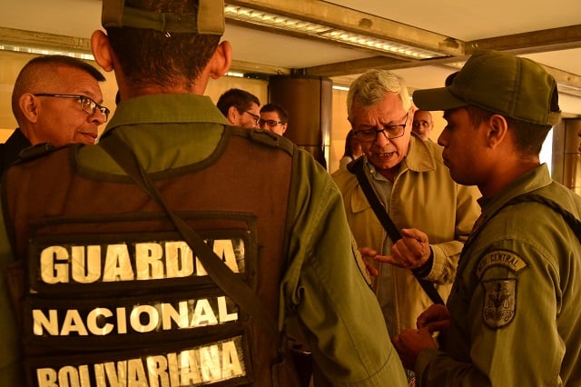 La CANTV "atiende" con la Guardia Nacional y no con los funcionarios obligados a dar respuesta. Los agentes conminaron al grupo de Aporrea (que iba a buscar respuesta a una carta de reclamo por bloqueo) a abandonar el recinto de recepción a la entrada de CANTV. Gonzalo Gómez, de Aporrea, explica la situación a los de la GNB, para que no se confundan y que brinden apoyo a ciudadanos que reclaman derechos; no a quienes se los violan