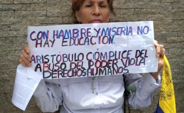 Carmen Castillo, jubilada del Inces, con 40 años de servicio declaró para Aporrea: en la actualidad me encuentro en esta protesta porque no tenemos calidad de vida, porque el presidente obrero nos arrebató todos los beneficios, nos ha sumido en una miseria total.