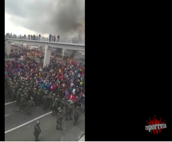 Domingo, 13 de octubre de 2019.- Una impresionante multitud del movimiento indígena del Ecuador al grito de '''El pueblo unido jamás será vencido'' hacen retroceder a la fuerza pública.