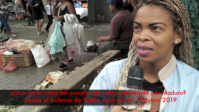 Luz Marina manifestó: a mi me parece bien...claro porque antes ni teníamos como invertir, ahorita son 150,, 300, ta bueno ese sueldo, horita me resuelvo con ese sueldo, antes no Credito: aporrea tvi |