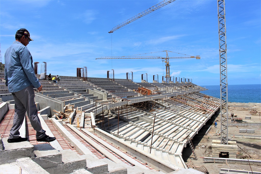 "Más de 800 hombres están trabajando de lunes a lunes en horario corrido para entregar la gran estructura deportiva. También se está abordando la fachada en estos momentos, los palcos de prensa ya están casi listos, los baños, ya ese encuentran encofradas las tuberías, se esta trabajando sin descanso todas las áreas para cumplir con lo que hemos prometido, los guaireños por primera vez en la historia verán jugar a su equipo en su propia casa", informó el gobernador de la entidad litoralense, García Carneiro, quien realizó una visita de inspección por la obra que esta prevista para ser entregada entre la segunda y tercera semana del mes de diciembre.