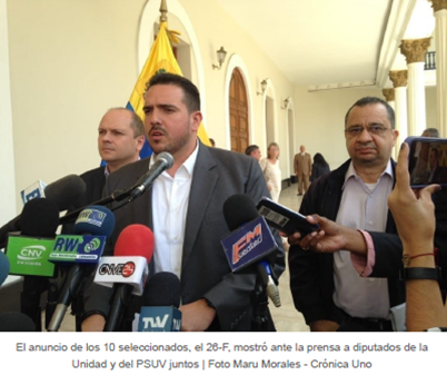 De acuerdo con esta información, los cinco seleccionados vinculados al gobierno nacional serían integrantes de la Asamblea Nacional Constituyente, mientras que los otros cinco estarían vinculados a la oposición.