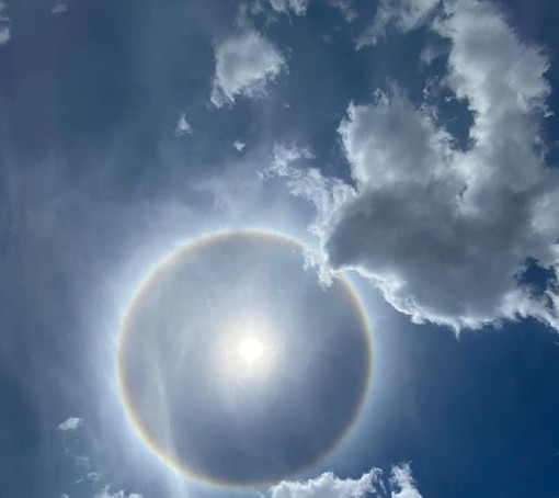"Nubes altas, conformadas mayormente por cristales de hielo, permiten observar en este momento, un fenómeno óptico atmosférico conocido como Halo Solar, mediante la refracción de la luz del Astro Rey, a través de dichos cristales", reseña la publicación.