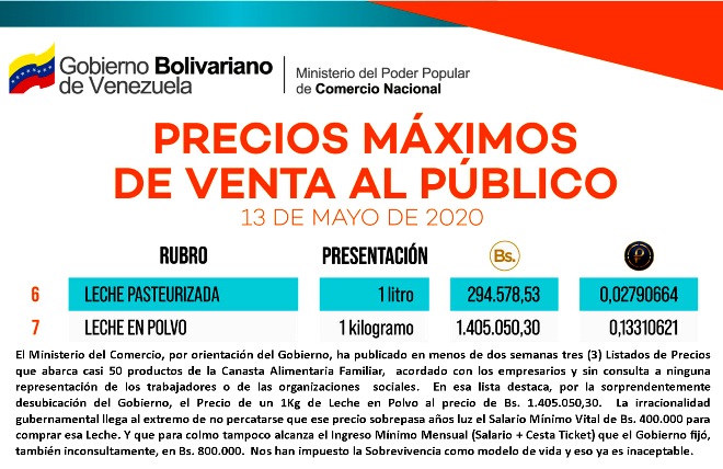 Productos alimenticios que han sido dolarizados por el Gobierno bajo la  intermediación del Ministerio del Comercio,  a través de una lista pública de  “Precios Acordados” que se indexan de acuerdo al Dólar Oficial (hoy fijado por el BCV en Bs. 188.130 x Dólar) y que significa una burla a quienes viven únicamente de miserables salarios que están a años luz del Costo de la Canasta Alimentaria.  Algo que nada tiene de exageración y que permite  medir la  sorprendente desubicación de un Gobierno que llama  a los empresarios para fijar precios, pero que no consulta a las organizaciones sociales, de trabajadores, campesinas, populares ni gremios profesionales para abordar el tema de Precios  ni mucho menos para fijar el Salario Mínimo Vital Nacional como establece y los obliga la Constitución.