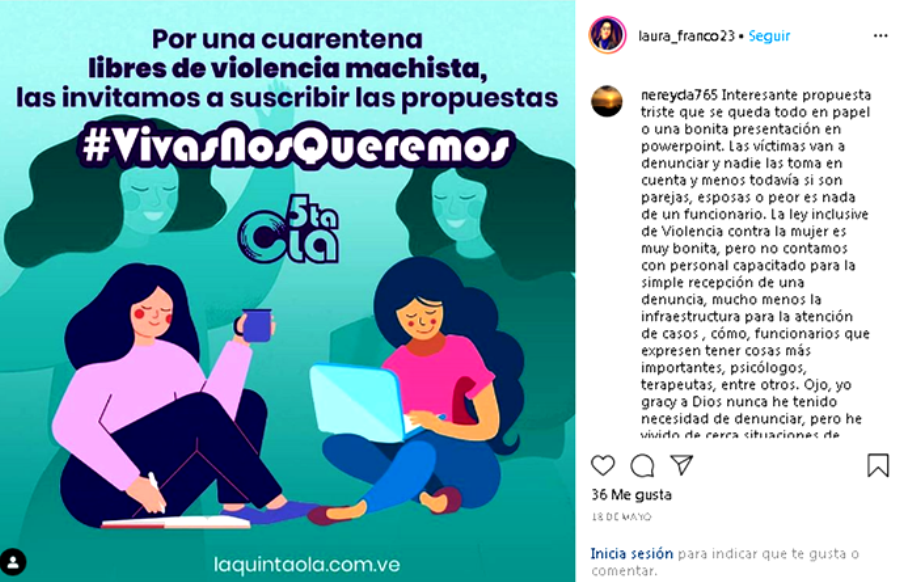 En una entrevista publicada en el portal Sputnik, Laura Franco, integrante de la organización venezolana la Quinta Ola, alertó que existe una realidad social que puede resumirse como un objetivo a cumplir en el país: «Visibilizar la pandemia de la violencia machista, que se cobra más vidas (en Venezuela) que el Covid-19«.
