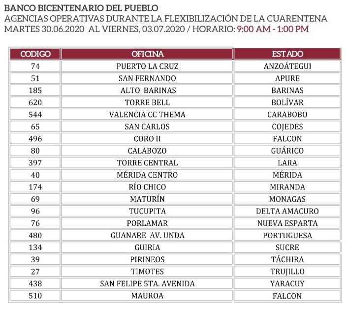 Cumpliendo con lo establecido por la Superintendencia de la Instituciones del Sector Bancario (Sudeban), las agencias bancarias atenderán al público en horario especial de 9:00 am a 1:00 pm., tanto a personas naturales como a jurídicas, sin importar el terminal de cédula de identidad.