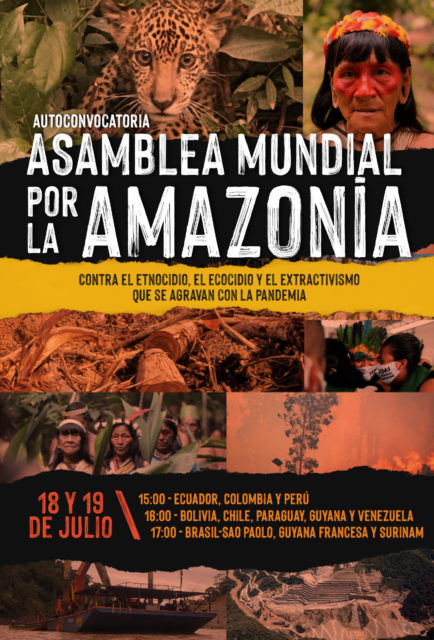 Frente a esta realidad, movimientos, colectivos, redes, activistas y organizaciones de pueblos indígenas, quilombolas, ribereños, siringueros (caucheros), caboclos, marrons, campesinos, artistas, religiosos, defensores de la naturaleza, comunicadores, académicos, mujeres, jóvenes y pobladores de las ciudades amazónicas, nos auto convocamos en la Primera Asamblea Mundial por la Amazonía que tendrá lugar de manera virtual el 18 y 19 de Julio.