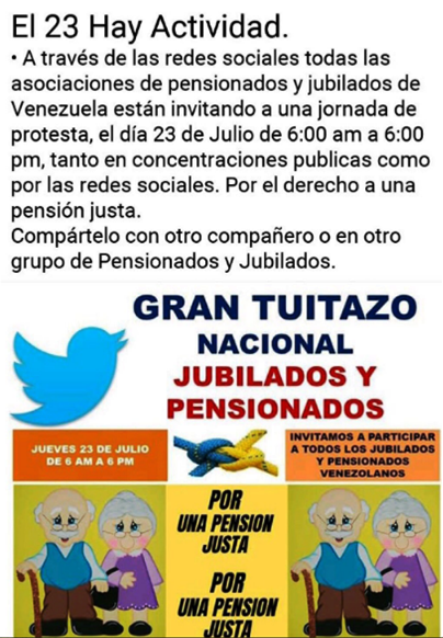 Los pensionados de toda Venezuela llamarón para el dia de hoy a movilizarse y hacer Un Tuitazo Nacional: