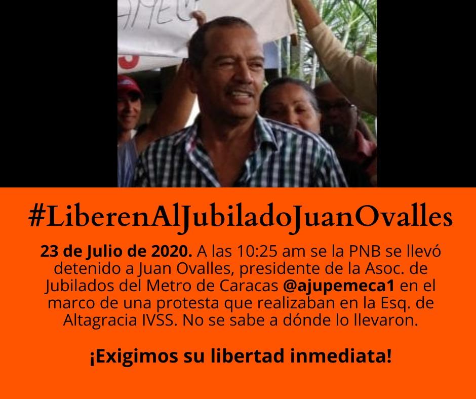 Según informan dispersaron la concentración y movilización que tenían pautada hoy los jubilados y pensionados en la Plaza de La Moneda y hay varios detenidos, entre ellos, un dirigente pensionado: Juan Ovalles Colmenares, Presidente de la Asociación de Jubildados y Pensionados del Metro de Caracas.
