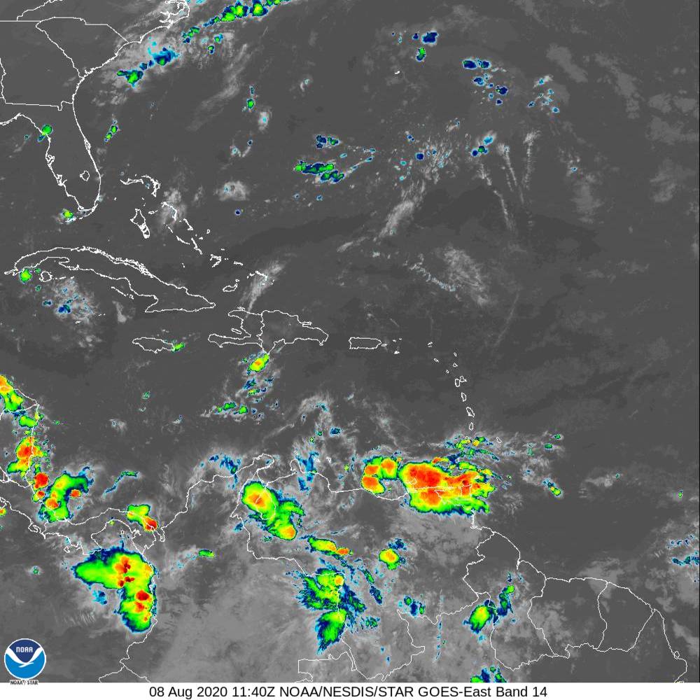 8 de agosto de 2020.- De acuerdo al pronóstico del tiempo suministrado por el Instituto Nacional de Meteorología e Hidrología INAMEH, la Onda Tropical Nº 31 de la temporada, se desplaza sobre el Esequibo e interactúa con la actividad moderada de la Zona de Convergencia Intertropical sobre la línea costera del país; originando abundante nubosidad y precipitaciones de intensidad variable, algunas con descargas eléctricas y eventuales ráfagas de viento en gran parte del territorio nacional.