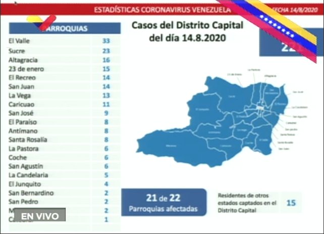 Informó que el Distrito Capital continúa registrando el mayor número de contagios en las 22 parroquias, El Valle, Sucre-Catia, Altagracia, 23 de Enero, San Juan, La Vega, Caricuao y San José, "son en las que se encuentra concentrado el virus", aseguró.