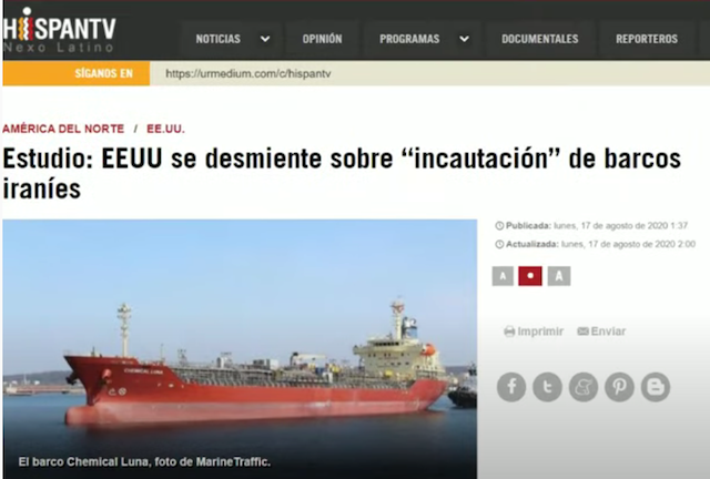 Martes, 18 de agosto de 2020.- Nacho Rodríguez y Toño Villamil de El Chapucero USA, desmintieron en un video el lunes 17 de agosto, publicado en YouTube, que los cuatro barcos supuestamente iraníes decomisados por autoridades estadounidenses por llevar combustible a Venezuela, realmente no son iraníes, según revelaron autoridades iraníes y que todo se trata de una noticia falsa emitida por EEUU.