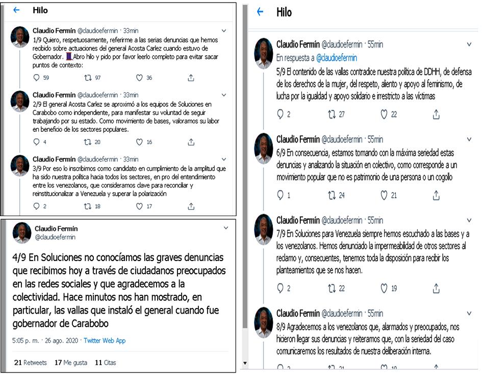 El conocido militar del eructo y ex gobernador del Estado Carabobo Acosta Carles, hoy se ha convertido en tendencia nacional en la red de twitter, debido a que fue postulado por el Partido Soluciones como candidato a la Asamblea Nacional (AN) y eso origino una serie de objeciones y denuncias por parte de electores que objetan esa postulación, lo cual originó un pronunciamiento por parte de Claudio Fermín vía twitter y conformado por el siguiente hilo:
