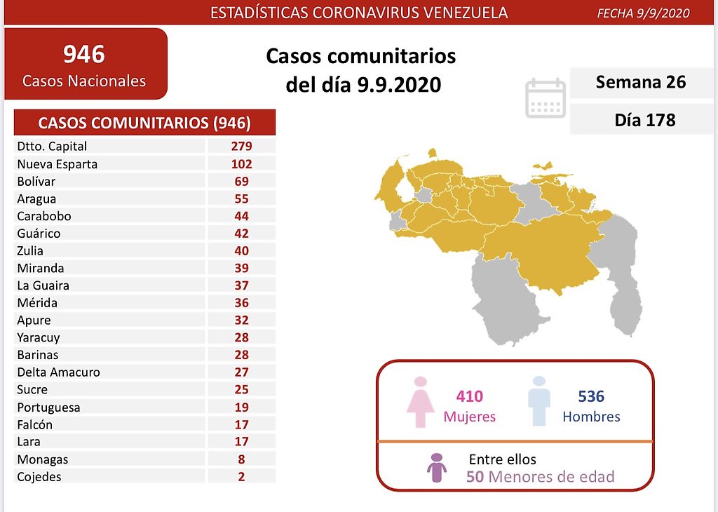 9 de Septiembre - La Vicepresidenta, Delcy Rodríguez informó este miércoles, que en las últimas 24 horas se registraron 1.188 casos positivos al Covid-19 y se eleva a 56.751 el número de contagiados. Las declaraciones las hizo Rodríguez a través de su cuenta en Twitter.