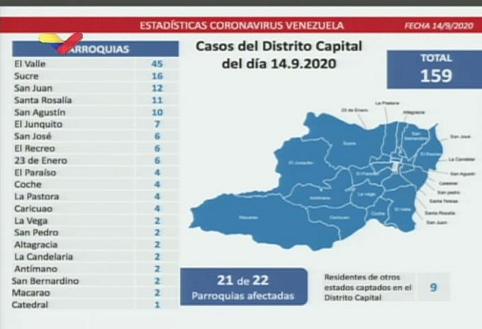 - Distrito Capital: 159 nuevos casos en 21 de las 22 parroquias capitalinas, concentrándose el mayor número de casos en: El Valle con 45, Sucre (Catia) con 16, San Juan con 12 y Santa Rosalía con 11.