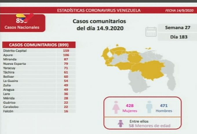 14.09.20 - El ministro de Comunicación venezolano, Freddy Ñáñez, informó de 1.029 casos de coronavirus Covid-19, de los cuales 899 son casos de transmisión comunitaria y 130 son casos importados y 9 fallecidos.