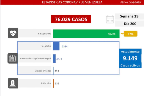 Venezuela suma un total de 76.029 casos de Covid-19, de los cuales 9.149 se encuentran activos, 66.245 recuperados (87%), 6.324 están en Hospitales, 2.472 en CDI, 353 en Clínicas Privadas y la lamentable cifra de 635 fallecidos.