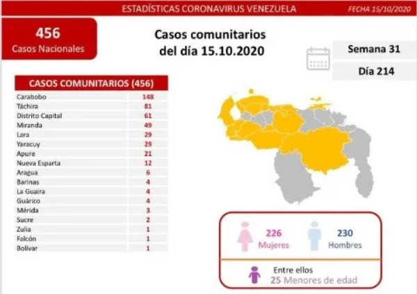 Asimismo, informó que lamentablemente 6 venezolanos fallecieron a causa del virus: 2 hombres de 48 años en el estado Miranda, 2 hombres de 53 y 64 años en Mérida y 2 hombres de 70 y 67 años en el estado Apure.