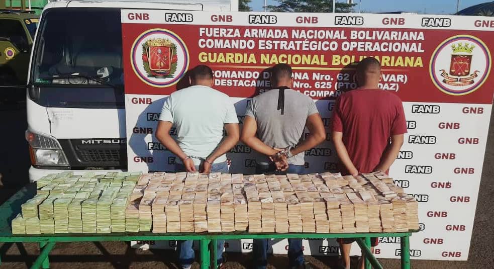 16 de octubre de 2020.- El Comandante de Zona N°62 G/B Rodríguez Cepeda informó que cumpliendo instrucciones del Comandante General de la Guardia Nacional Bolivariana MG Fabio Zavarse Pabón, se efectuó la detención de tres (03) ciudadanos con tres mil millones de Bolívares Soberanos en efectivo (3.000.000.000 Bs) transportados de manera oculta.