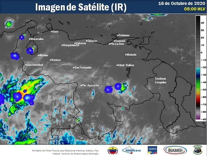 16 de octubre de 2020.- Se prevé incremento de la actividad nubosa en gran parte del territorio venezolano, originándose precipitaciones de intensidad variable, algunas con actividad eléctrica y eventuales ráfagas de viento, especialmente después del mediodía.