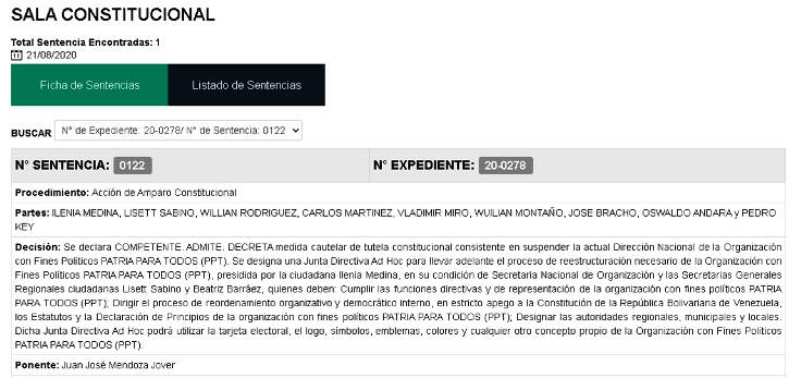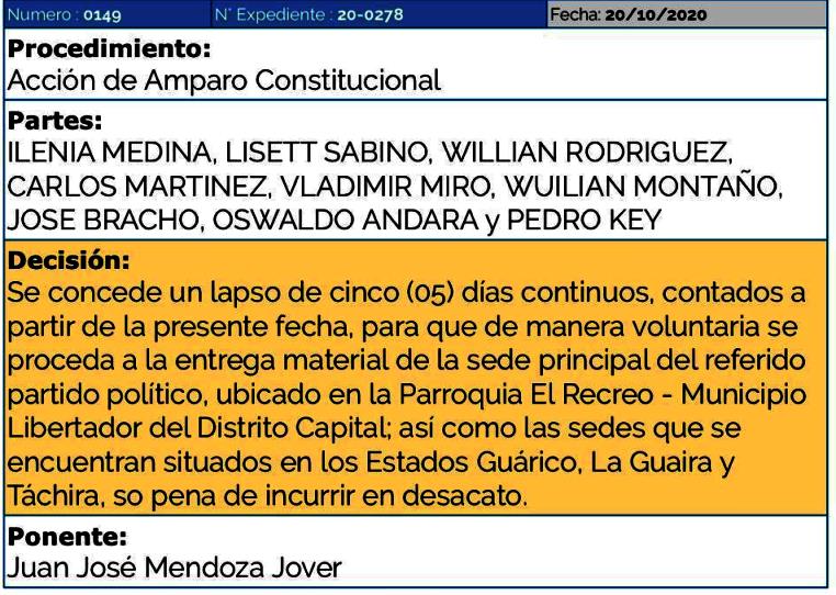 A través de un Amparo Constitucional, introducido por Ilenia Medina, Lisett Sabino, Willian Rodriguez, Carlos Martinez, Vladimir Miro, Wuilian Montaño, Jose Bracho, Oswaldo Andara y Pedro Key, la Sala Constitucional del Tribunal Supremo de Justicia concede al PPT, dirigido por los anteriores solicitantes, “un lapso de cinco (05) días continuos, contados a partir de la presente fecha (20 de octubre 2020), para que de manera voluntaria se proceda a la entrega material de la sede principal del referido partido político, ubicado en la Parroquia El Recreo - Municipio Libertador del Distrito Capital; así como las sedes que se encuentran situados en los Estados Guárico, La Guaira y Táchira, so pena de incurrir en desacato”.