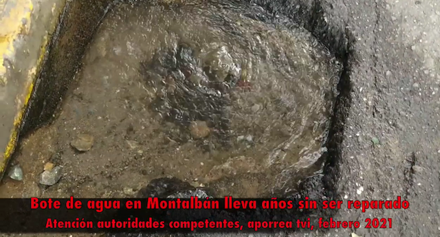 En la avenida Teherán de Montalbán, frente al complejo habitacional Juan Vives Suriá, justo al lado de la Conferencia Episcopal y la construcción paralizada del Cardiológico para Adultos y Oncológico de Montalbán, (mejor conocido como El Elefante Rojo de Montalbán), hay un bote de agua que tenemos años reportando y que continuamente, noche y día, sin parar, desperdicia agua limpia que se pierde y el gobierno nacional no ha tomado cartas en su reparación, en su arreglo.