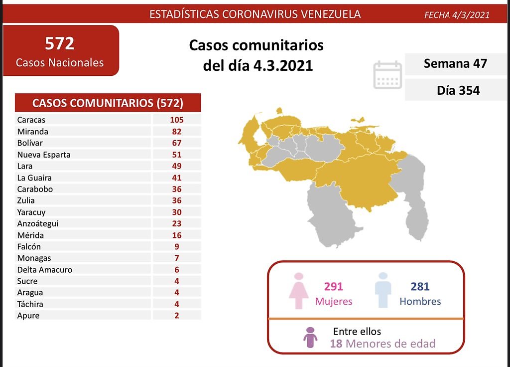 A través de su cuenta en la red social Twitter, la vicepresidenta Ejecutiva de la República, Delcy Rodríguez, detalló que 572 son casos de transmisión comunitaria y cinco importados .